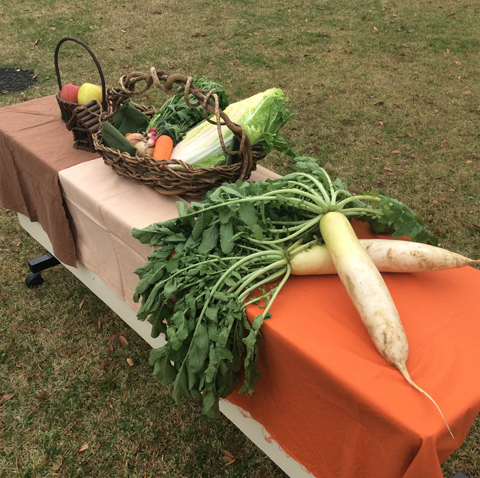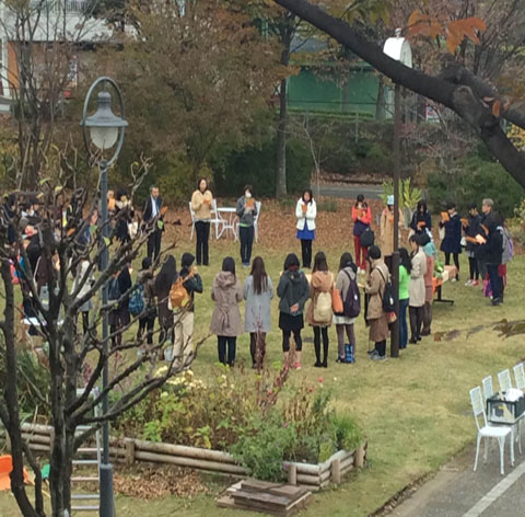 恵泉女学園大学では、多くの教会で行われている「収穫感謝礼拝」への思いを心にとめ、私たちの教育農場で収穫された作物を囲み、その恵みに対して神に感謝を表すため、毎年礼拝と趣向を凝らした催しで恵みを分かち合っています。 今年は「みのり」をテーマに、礼拝では自分と向き合い、学生生活4年間を振り返る中で種蒔かれた様々な思いを語ってくれた学生の感話を分かち合いました。 礼拝後、里地里山プロジェクトのメンバーが育てたお米でおにぎりを作り、課外園芸活動「恵泉やさい」のメンバーから購入したお野菜入りのだんご汁を一緒にいただきました。 少し冷たい雨が降る中でしたが、心も体も満たされたひとときでした。
