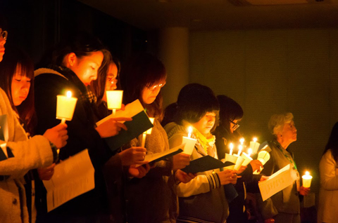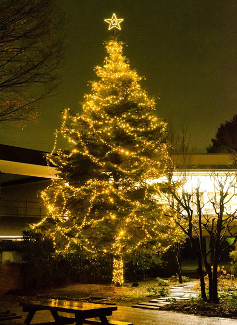 恵泉女学園大学では、アドヴェントの訪れを告げる時として、クリスマスツリーに点灯する瞬間を、礼拝の中で共に分かち合っています。 今年はあいにくの雨でしたので、室内に会場を移し、窓越しに見えるクリスマスツリーを眺め、点火式後、温かい飲み物とおいしいケーキをいただき、友人や先生方と心も体も温めました♪