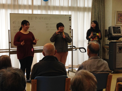 本学「恵泉お話を語る会(恵話会)」のメンバー5名が、1月29日(木)に白楽荘を訪問し、30名余りの利用者の方々と楽しい時間を過ごしました。恵話会メンバーによる45分間の語りや手遊びの活動後、3つのグループに分かれ、利用者の方々との談話や歌などを通して有意義な時間を共有しました。日本語での「語り」の経験を重ねてきた恵話会メンバーにとって「継続は力なり」を強く感じた機会となりました。
