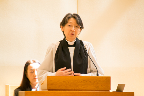 各学科・各研究科より1名の学生たちが恵泉での日々の喜びや苦しみ、学びと気づきをそれぞれの言葉で素直に語られた感話を共に聴き、その思いを分かち合うことができました。引き続き、立教女学院チャプレン上田亜樹子(あじゅこ)先生より、奨励を賜りました。人間の物差しではとるに足りないものであったとしても、神様は賜物を私たち一人一人に託され、それぞれの使命を果たすために生かされているということ、またその賜物はキラキラと輝く宝石のようであること。あらためて、私たちのいのちの意味をとらえ直す時となり、大きな励ましを与えられました。