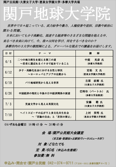 現代社会学科の上村教授と国際社会学科の定松教授が大妻女子大学・恵泉女学園大学・多摩大学共催「関戸地球大学院」で講義を行います。