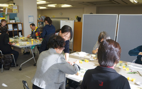 準備ではまず、フラワーアレンジメントが専門の教員の指導のもとで学生が試作し、一番難しいと感じた作業については、学生が当日までに下準備として作っておくことになりました。前に出て作り方を指導する学生は、デモンストレーションの練習もしました。最後に、一人ずつの材料をパッキングして会場へ搬入して準備完了です。