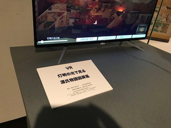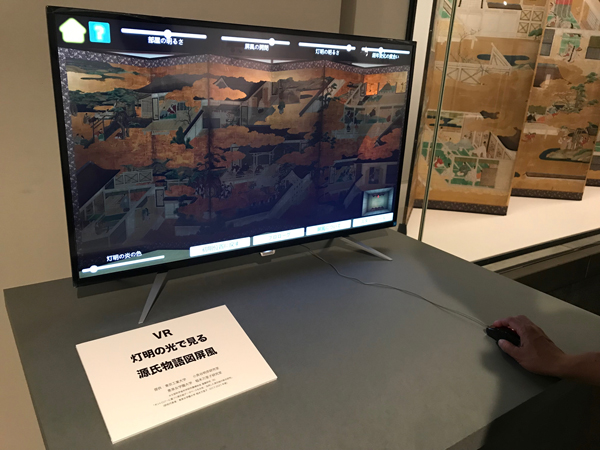 9月2日から4日まで開催されたICOM(国際博物館会議)京都大会のミュージアムフェアでも、東京富士美術館のブースの一画を借りて、灯明で見る「源氏物語図屏風」のVRデモンストレーションがおこなわれました。灯明の揺らぎと金箔が反射の再現に、来場者からは驚きの声があがっていました。