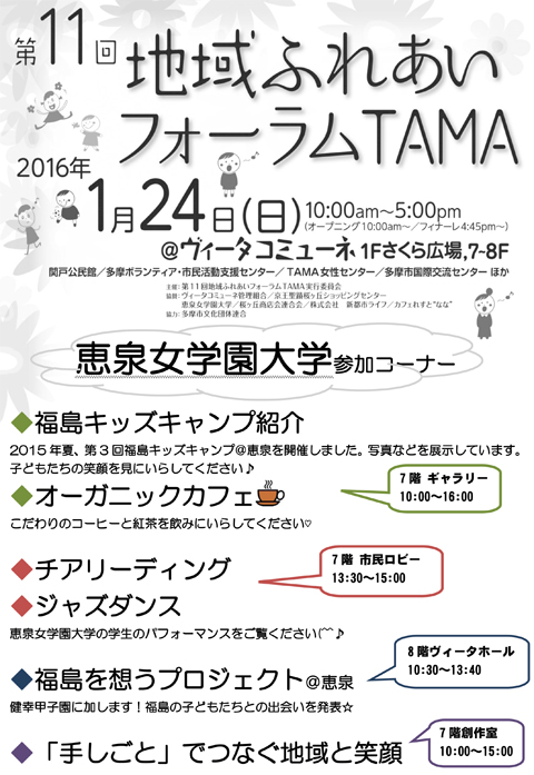 恵泉女学園大学の学生・教職員有志「福島を想うプロジェクト@恵泉」と、恵泉オーガニックカフェが、「第11回地域ふれあいフォーラムTAMA」に出展します。